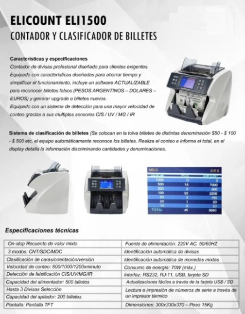 Se colocan en la tolva billetes de distinta denominación $50 $100 $500 etc, el aequipo automáticamente reconoce los billetes. Realiza el conteo e informa el total, en el display detalla la información discriminando cantidades y denominaciones.